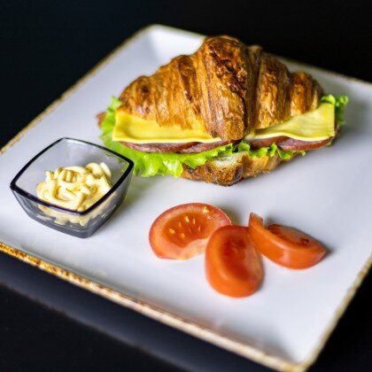 слоеное тесто, консервированный тунец, лук, сыр филадельфия, рукола, помидор, винный соус