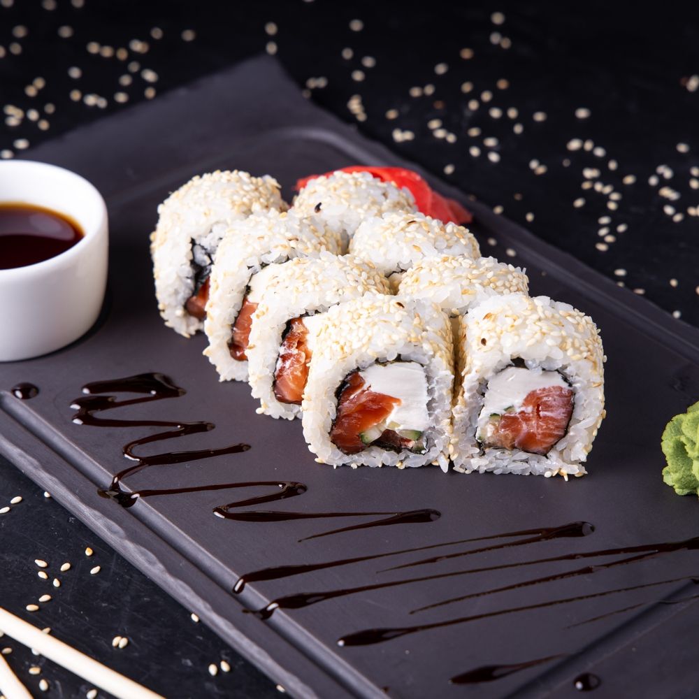 суши рис, сливочный сыр, лосось, помидор, огурец, кунжут, нори