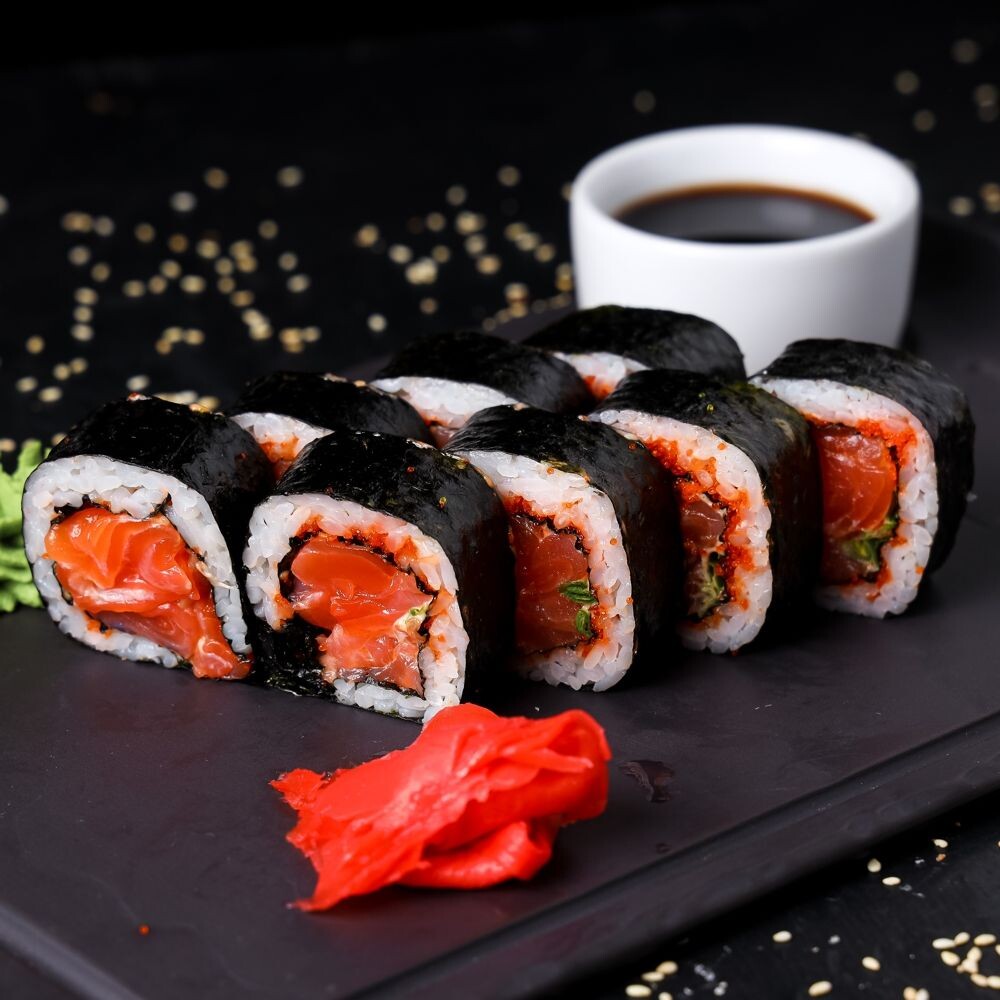 суши рис, лосось слабосоленый, зеленый лук, икра летучей рыбы, спайси соус, нори