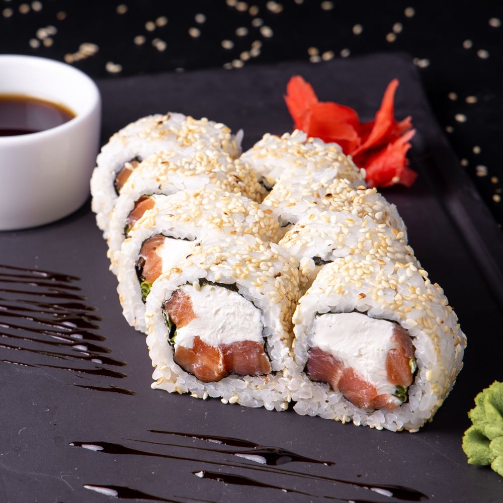 суши рис, сливочный сыр, копченый лосось, зеленый лук, кунжут