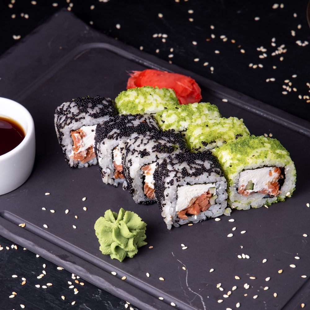суши рис, сливочный сыр, жареный лосось, огурец, икра летучей рыбы, нори