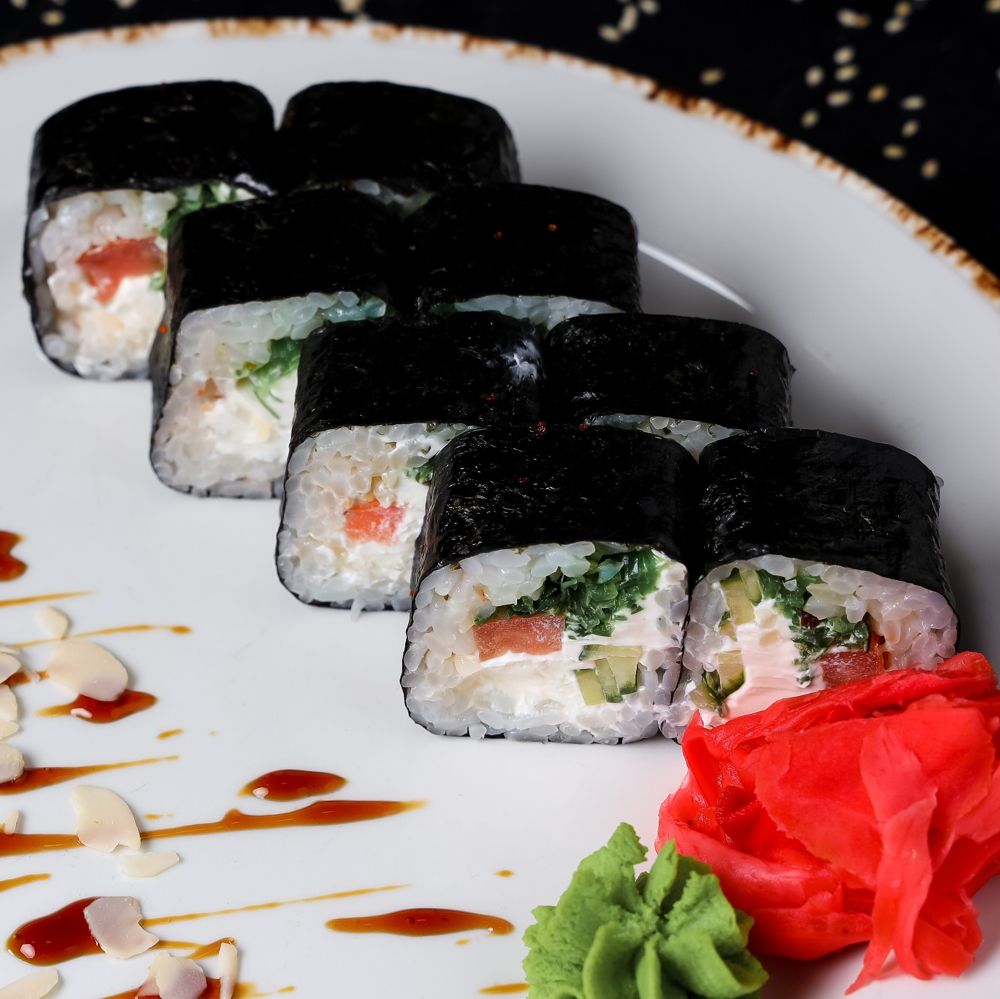 суши рис, сливочный сыр, чука салат, помидор, огурец, нори