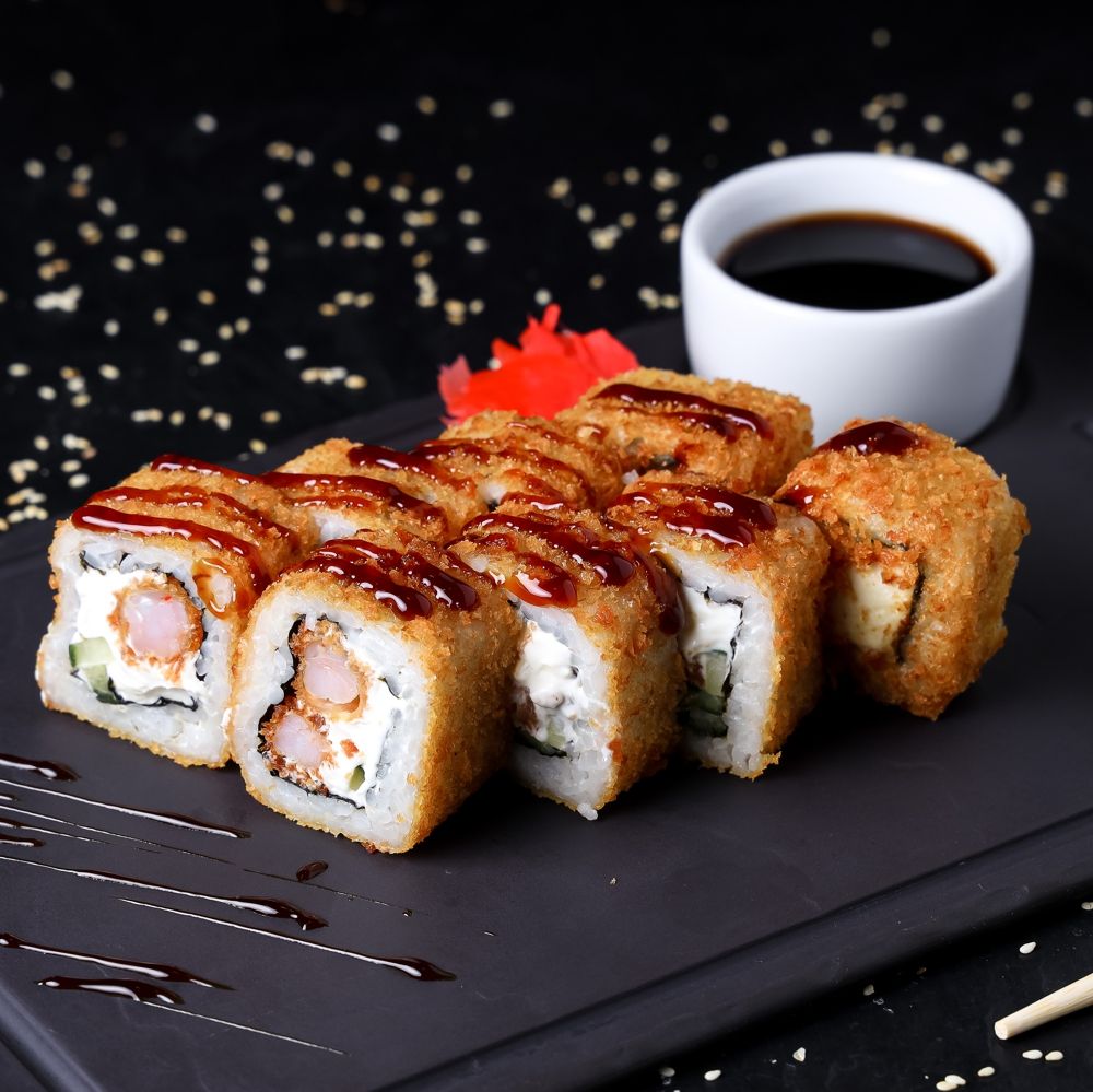 суши рис, сливочный сыр, королевская креветка, огурец, нори, сухари панко, темпурная мука