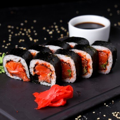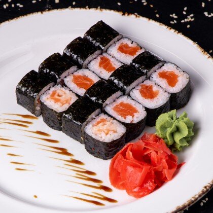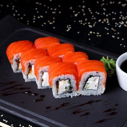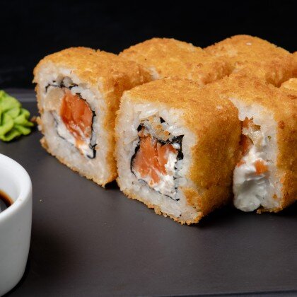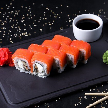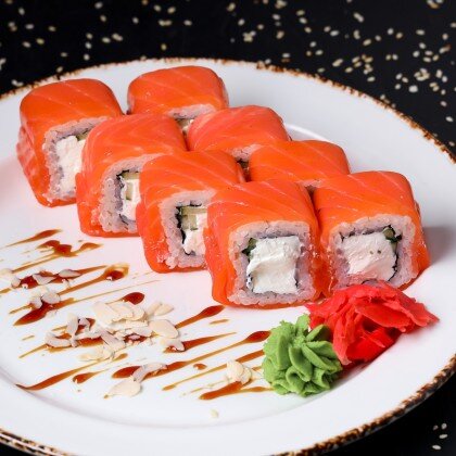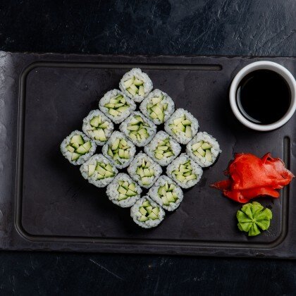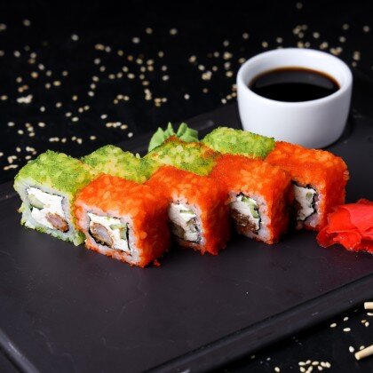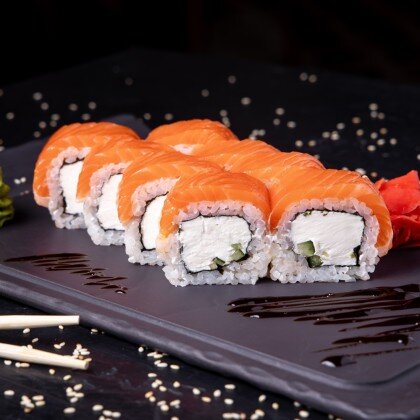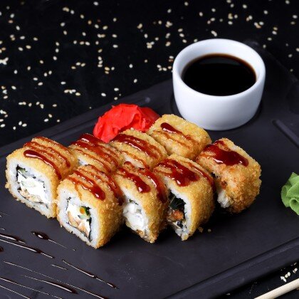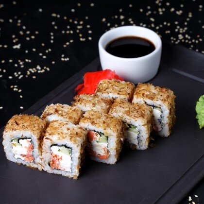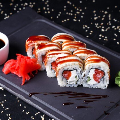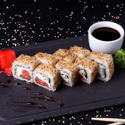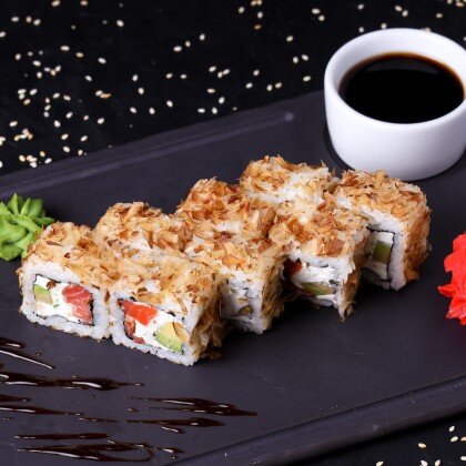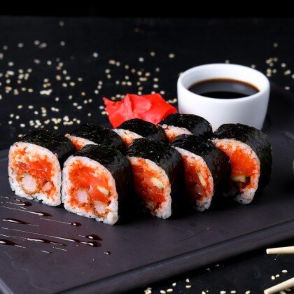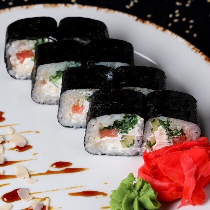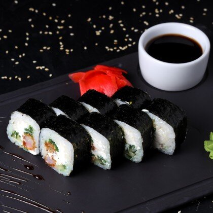 суши рис, курица копченая, огурец, сливочный сыр, твердый сыр, нори, спайси соус