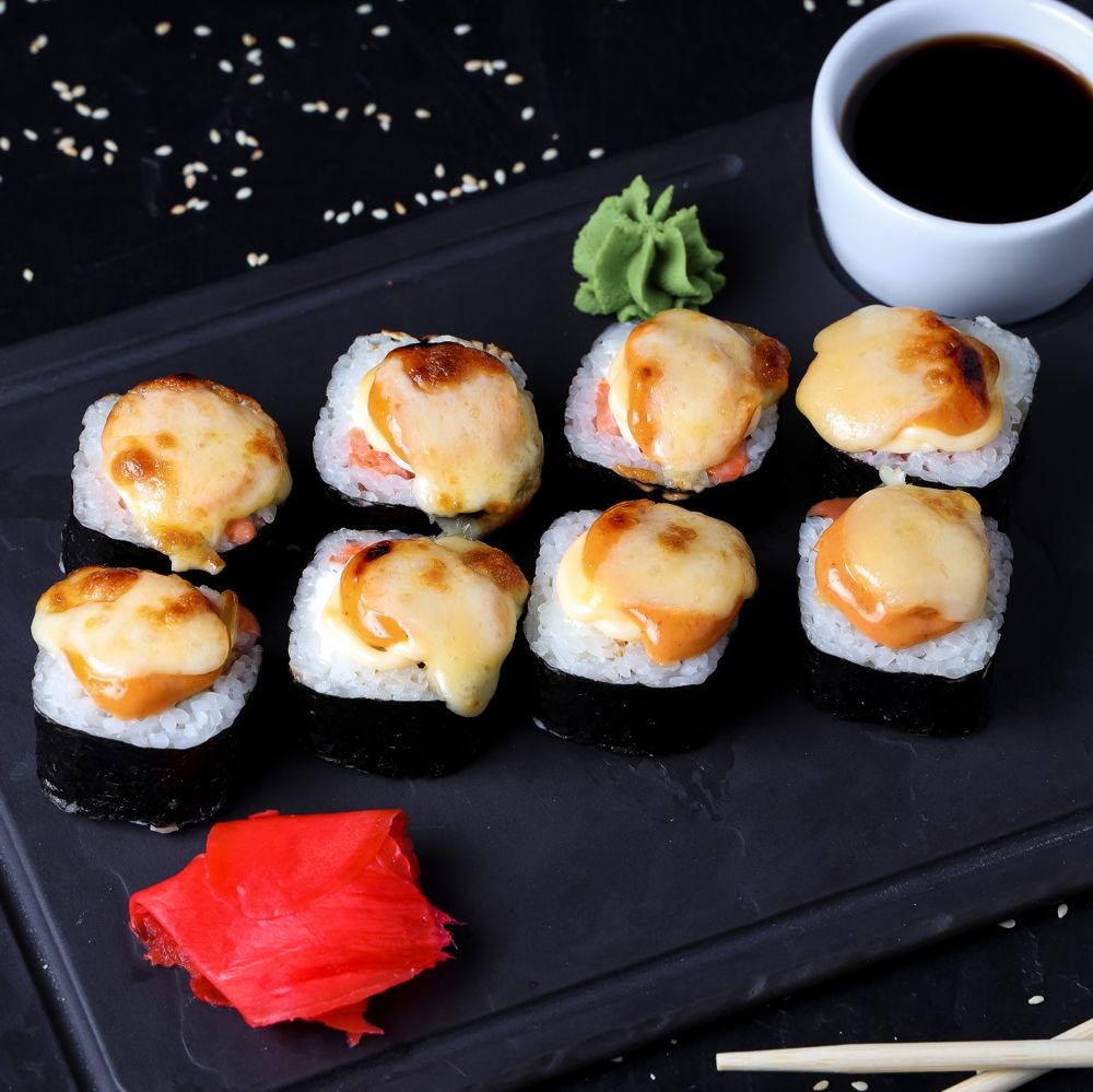 суши рис, жареный лосось, жареный угорь, сливочный сыр, твердый сыр, нори, спайси соус