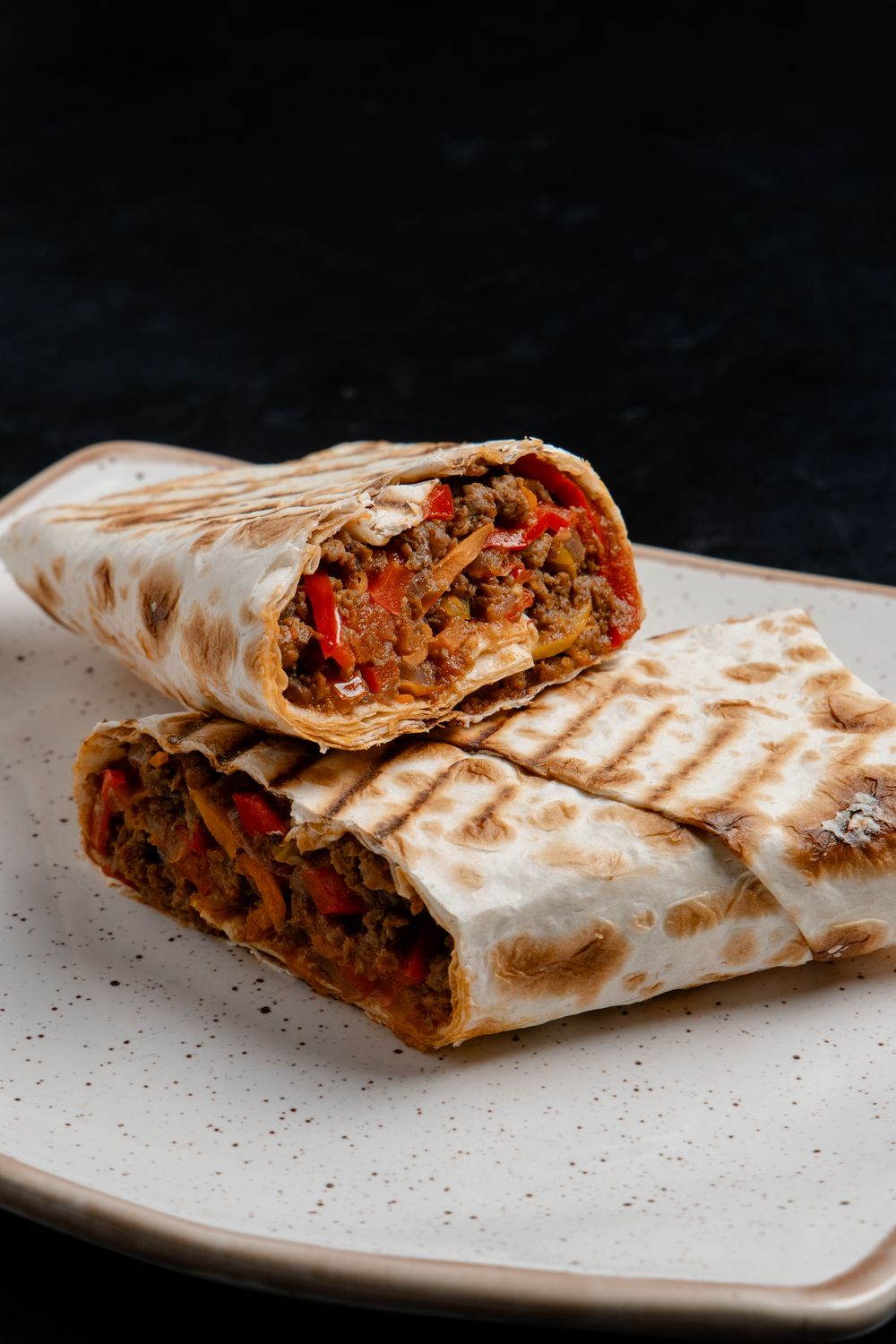 жареный фарш, лук, морковь, болгарский перец, лаваш, помидор, перец чили
