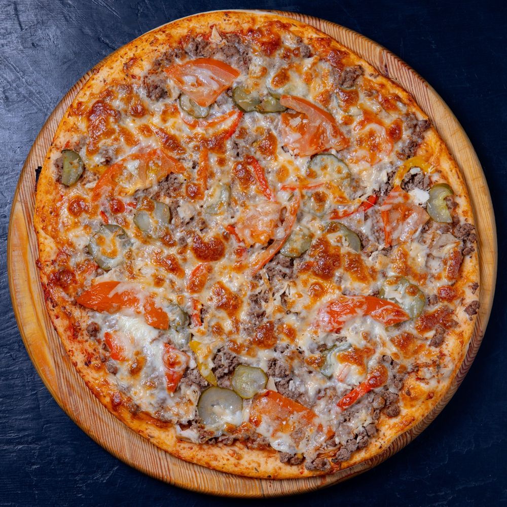фарш, маринованный огурец, болгарский перец, куриное филе, сыр, помидоры
