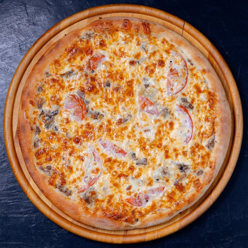 грибы жареные, лук жареный, сыр, фарш говяжий, омлет, помидоры, соус дёнер