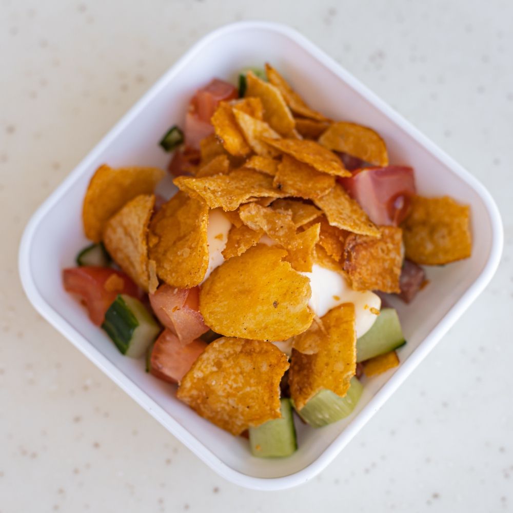 колбаса копченая, огурец, помидор, чипсы, майонез