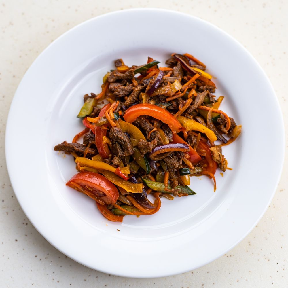 говядина, болгарский перец, лук, морковь, огурец, помидор, соевый соус, соус терияки, аджика, кунжут, чеснок, масло растительное